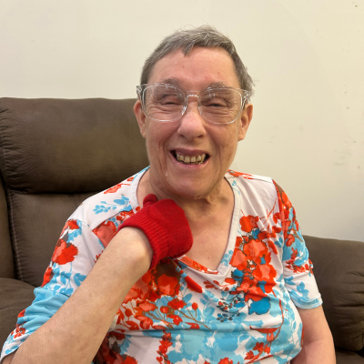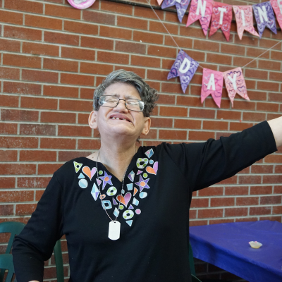 With her signature red hair and bright pink nails, Sharon has been a vibrant part of the Laradon community since 1978, a remarkable 47-year journey. Over her time here, Sharon has experienced and achieved so much: from working diligently at the Holiday Inn cleaning rooms, to building a lasting friendship with others like Dennis, to settling into a loving Host Home.