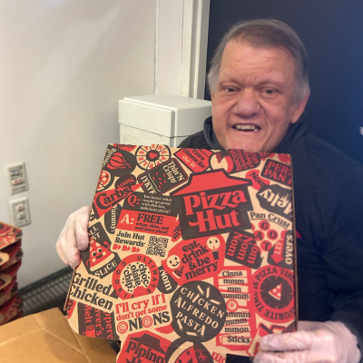 Today, he works three days a week at Pizza Hut, folding pizza boxes with the guidance of long-time Laradon job coach, Gloria.